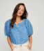 This peasant-style top features a button-front design with short sleeves finished in elastic cuffs for a soft, gathered effect. Contrast stitching highlights the pleated detailing along the sleeves, adding subtle dimension. Wilson Location