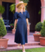Designed with gathered shoulders and elasticized puff sleeves for soft volume, plus supportive bust darts for shaping, this dress falls to a refined midi length. Wilson Location