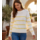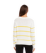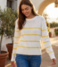 A classic pull-on crewneck sweater accented with soft, yellow stripes, featuring long sleeves and a relaxed, easy fit—perfect for casual, everyday layering. Wilson Location
