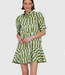 The Liv Dress is a playful mini dress with a tailored bodice and a relaxed drop-waist silhouette. It features short puff sleeves with cuff detailing, a classic shirt collar, and a partial button placket down the front. Wilson Location