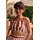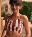 This strapless crop top by Olivia features a brown and white vertical stripe pattern with playful print. the Olivia-Lulu top is designed with a structured, fitted silhouette and straight neckline. Atlantic Beach Location.