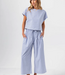 The Maya pant is made from 100% cotton poplin in a fresh navy stripe. This classic pull-on style features an easy drawstring waist and a wide leg silhouette that is slightly cropped. For reference, a size small measures 24.75 inches.