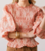 The Rose Gilded Palm Hali Top exudes elegance with its delicate palm print in soft rose hues and shimmering accents.