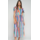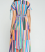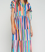 Long dress with multicolored stripes. V-neck with buttons, short sleeves with ties, and a defined waist. Ruffled skirt.
