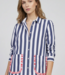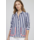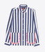 Navy and white striped shirt. Features a classic collar, button-front closure, and long sleeves. Includes two front pockets with contrasting red and white ruffles. Wilson Location
