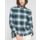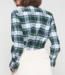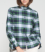 Green, navy and white tartan shirt with scattered multicolour strass embellishments. Features a stand-up ruffled collar and visible front button fastening.