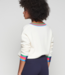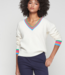100% wool cream sweater featuring a V-shaped neckline trimmed with green, pink, orange and blue stripes. Wilson location